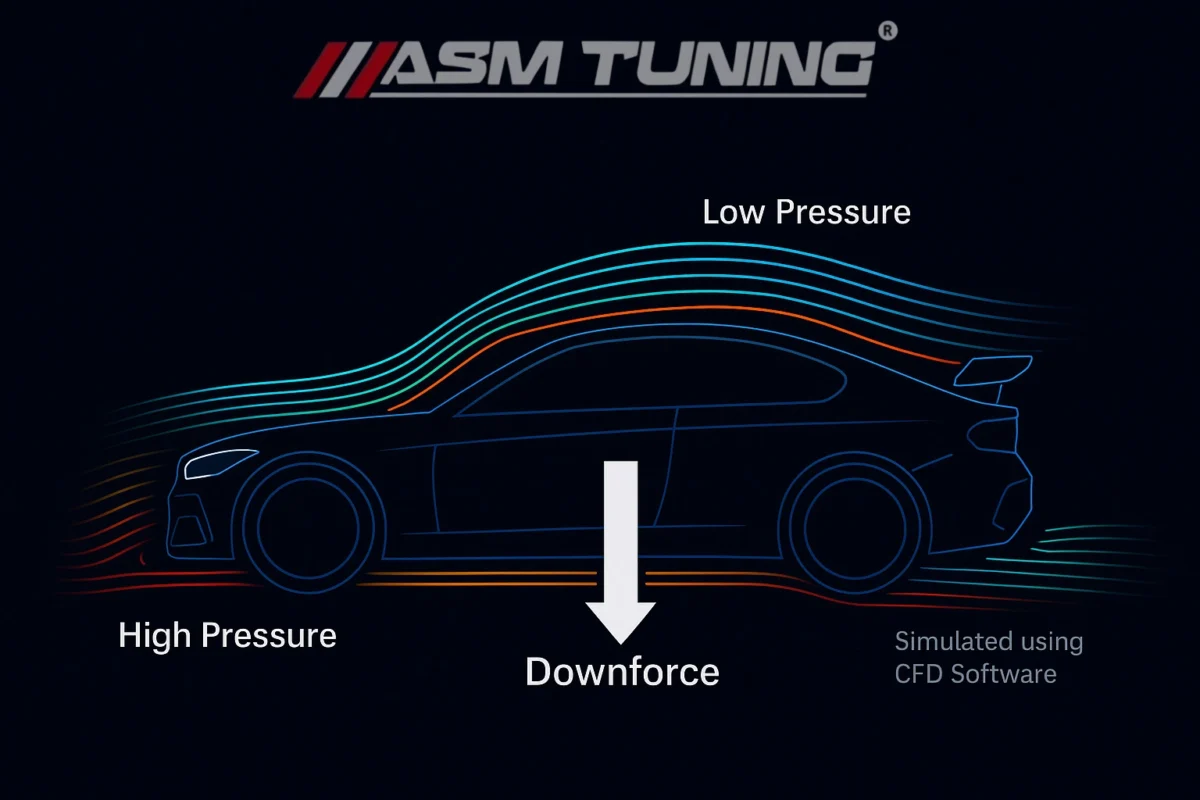 Forţă de apăsare sporită – presiunea creată deasupra splitterului apasă partea frontală pe asfalt, sporind tracţiunea şi stabilitatea în viraje.