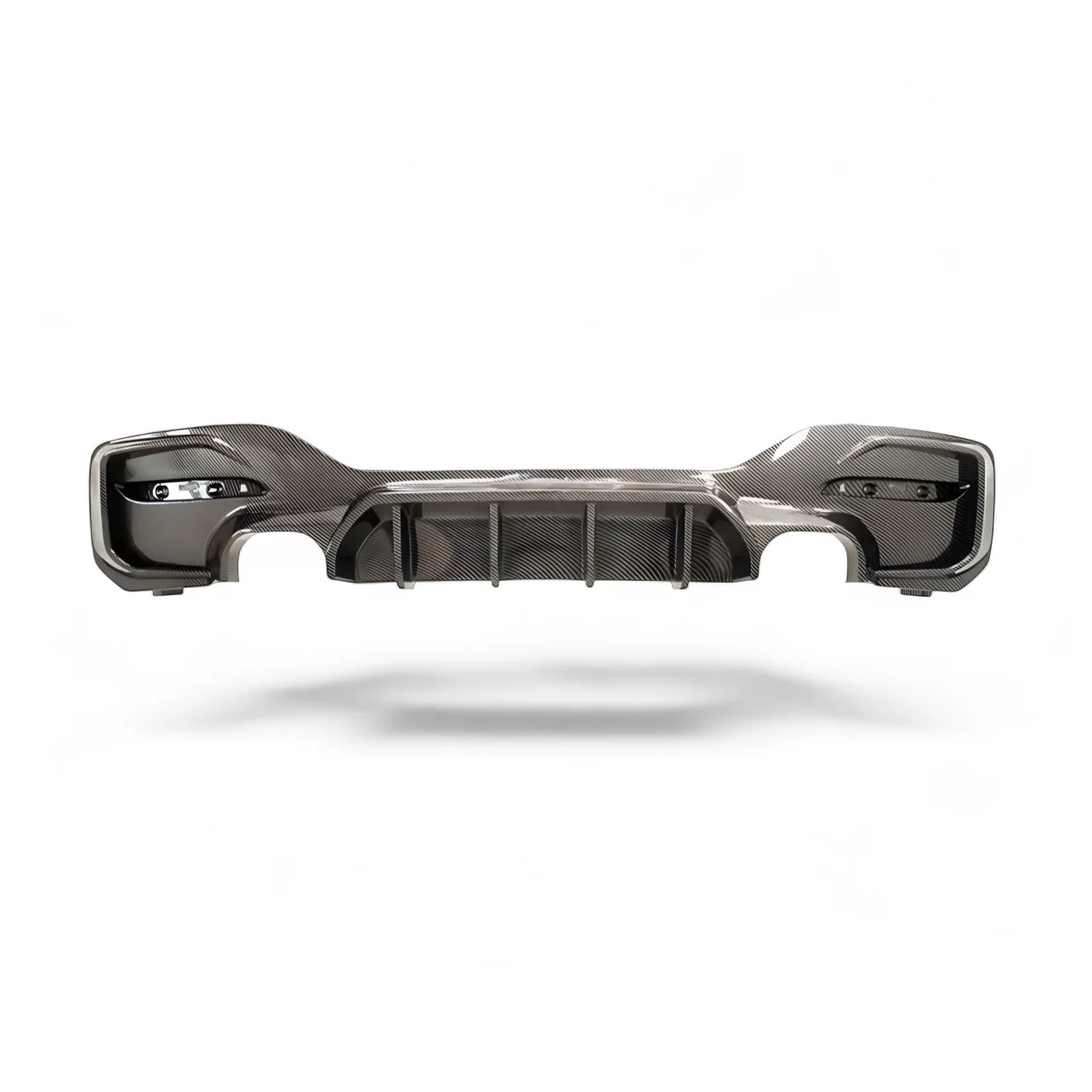 Difuzor spate din fibră de carbon M Style pentru BMW Seria 1 F20/F21. Design sportiv, compatibil cu bara M Sport și evacuare dublă.
