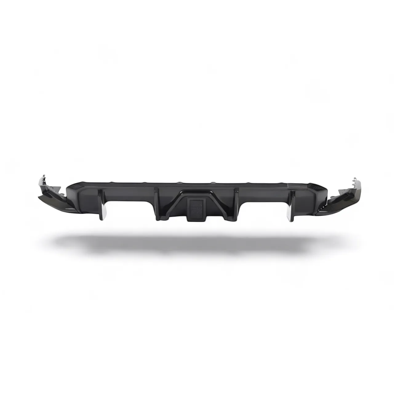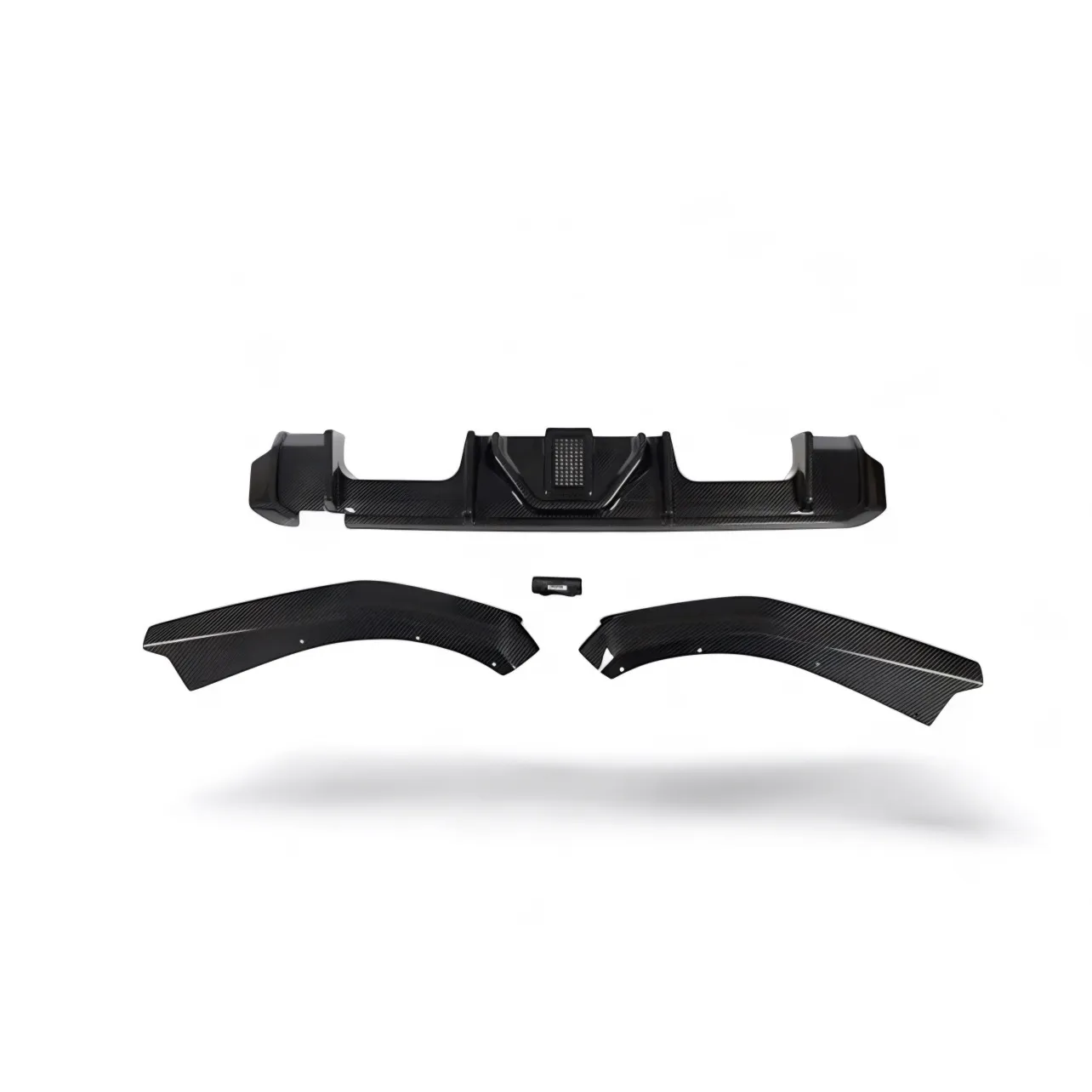 Difuzor bară spate cu LED integrat pentru BMW M3 G80/G81 și M4 G82/G83. Fabricat din dry carbon pre-preg lucios premium – design agresiv și compatibilitate OEM.