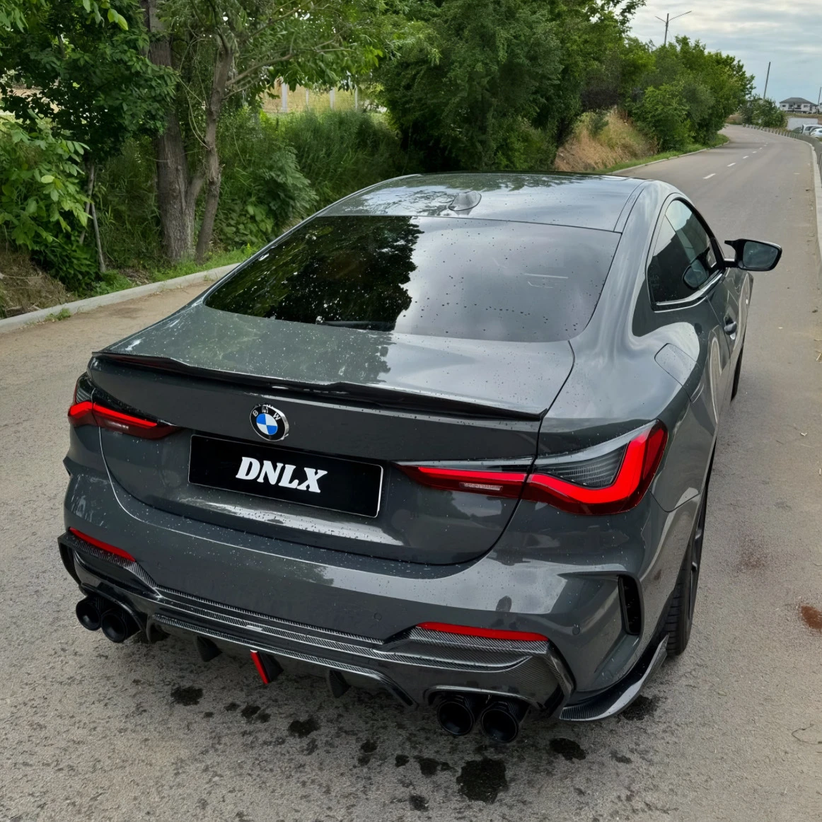 Difuzor bară spate din fibră de carbon cu LED integrat, compatibil BMW Seria 4 G22 (Coupe), G23 (Cabriolet) și G26 (Gran Coupé). Design sportiv, finisaj lucios și montaj OEM.